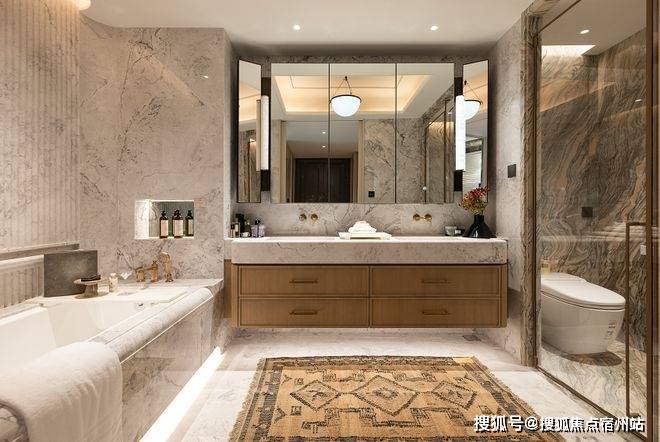 卫生间多处采用弧形处理,并设计了很多人性化细节,例如浴缸装有内嵌式扶手、边角为圆弧处理、台面增加古典腰线处理的挡水条,